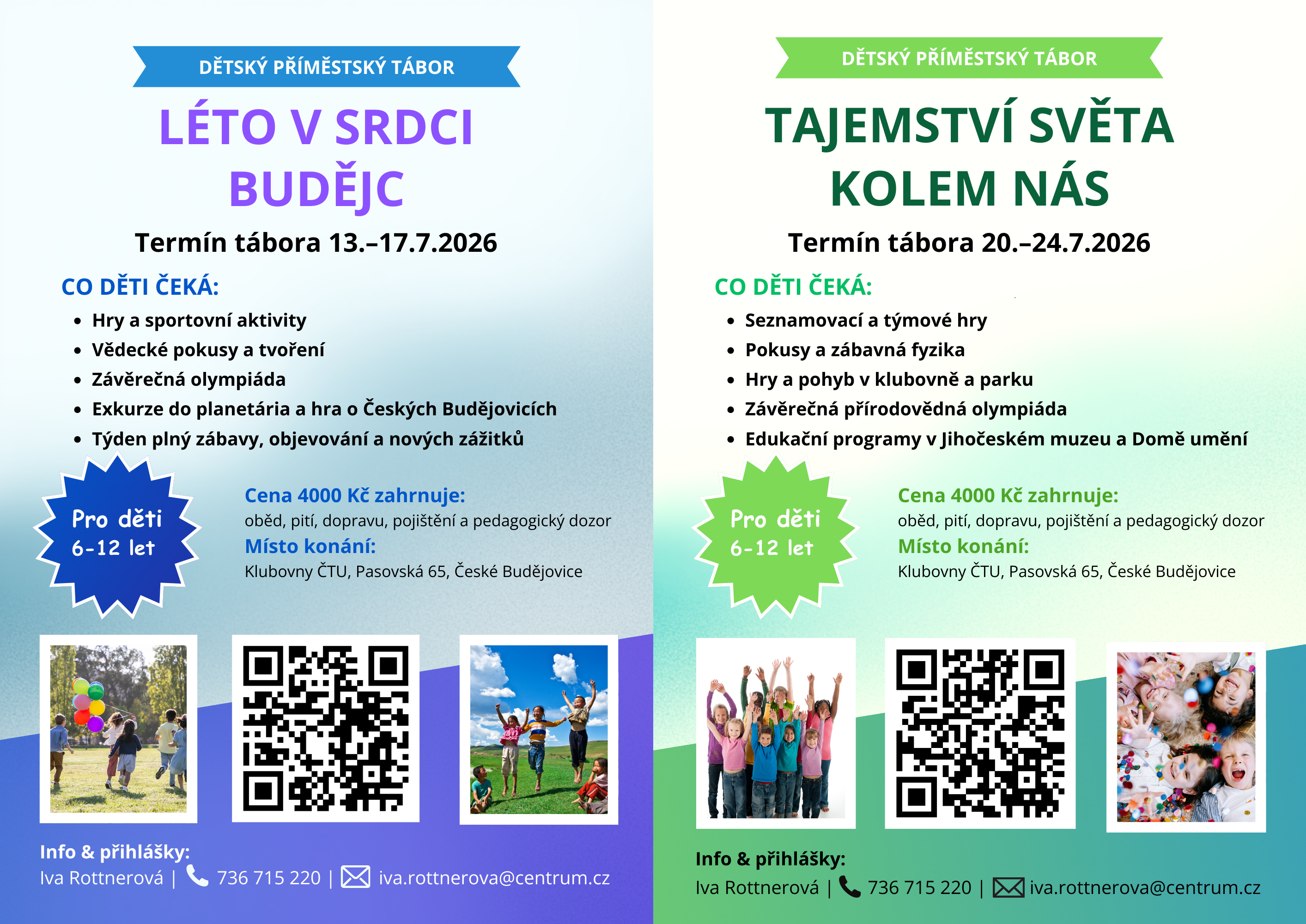 Jmenuji se Iva Rottnerová a ráda bych v létě pořádala dva příměstské tábory pro děti ve věku 6-12 let.